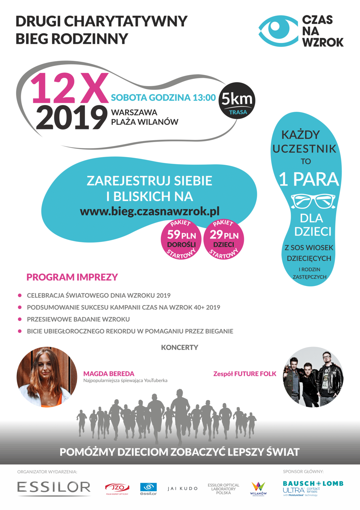 Le caractère caritatif de l'événement met l'accent sur l'objectif commun - aider les enfants. Les organisateurs remettront aux enfants pris en charge par l'association SOS Wioski Dziecięce en Pologne qui s'occupe des enfants abandonnés, orphelins et en danger de perdre la garde de leurs parents et aux familles d’accueil autant de paires de lunettes correctives que le nombre de participants de la Course Principale. Cette idée s'inscrit dans la continuité du programme Voir un avenir meilleur du groupe Essilor. Dans le cadre de l'action, les employés de l'entreprise effectuent des examens de la vue dans les orphelinats. 2. La course familiale Temps pour la vue est une excellente occasion d'améliorer la qualité de la vue d'autres enfants dans le besoin - cette fois des enfants pris en charge par SOS Wioski Dziecięce et des familles d'accueil.