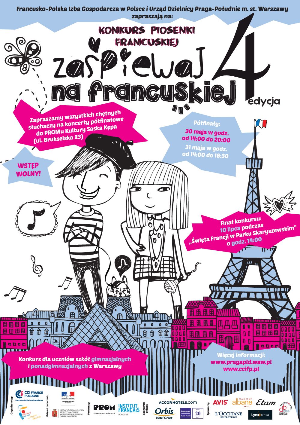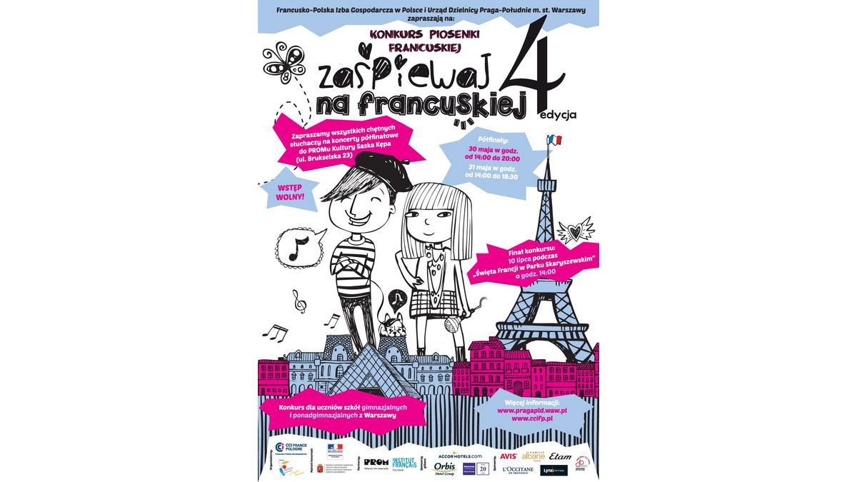 Le Concours de chanson française, organisé par la Chambre de Commerce et d’Industrie France Pologne sous le patronage du Maire de Praga du Sud et de l’Ambassadeur de France en Pologne, et en coopération avec l’Institut français de la Pologne et du PROM Kultury Saska Kępa, dans le cadre de la ? Fête de la France au Parc Skaryszewski ?, est destinée aux élèves des collèges et des lycées de Varsovie.