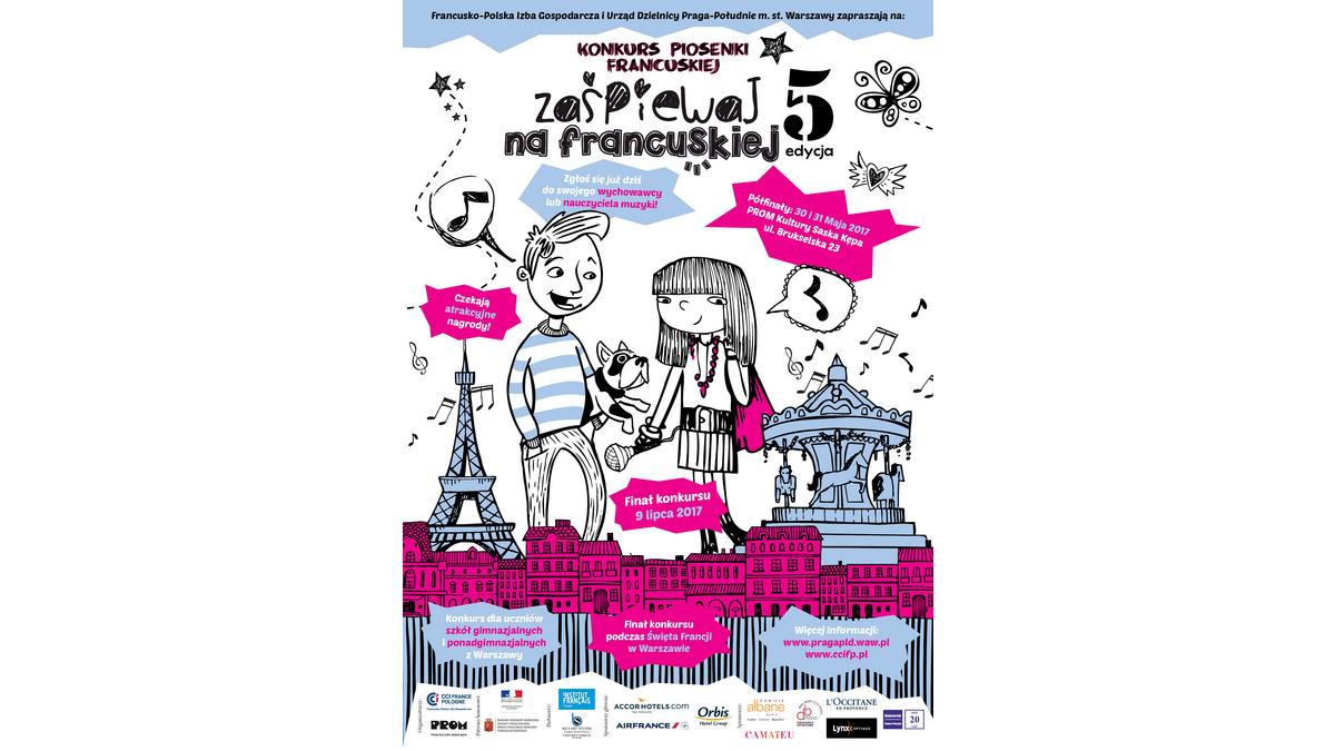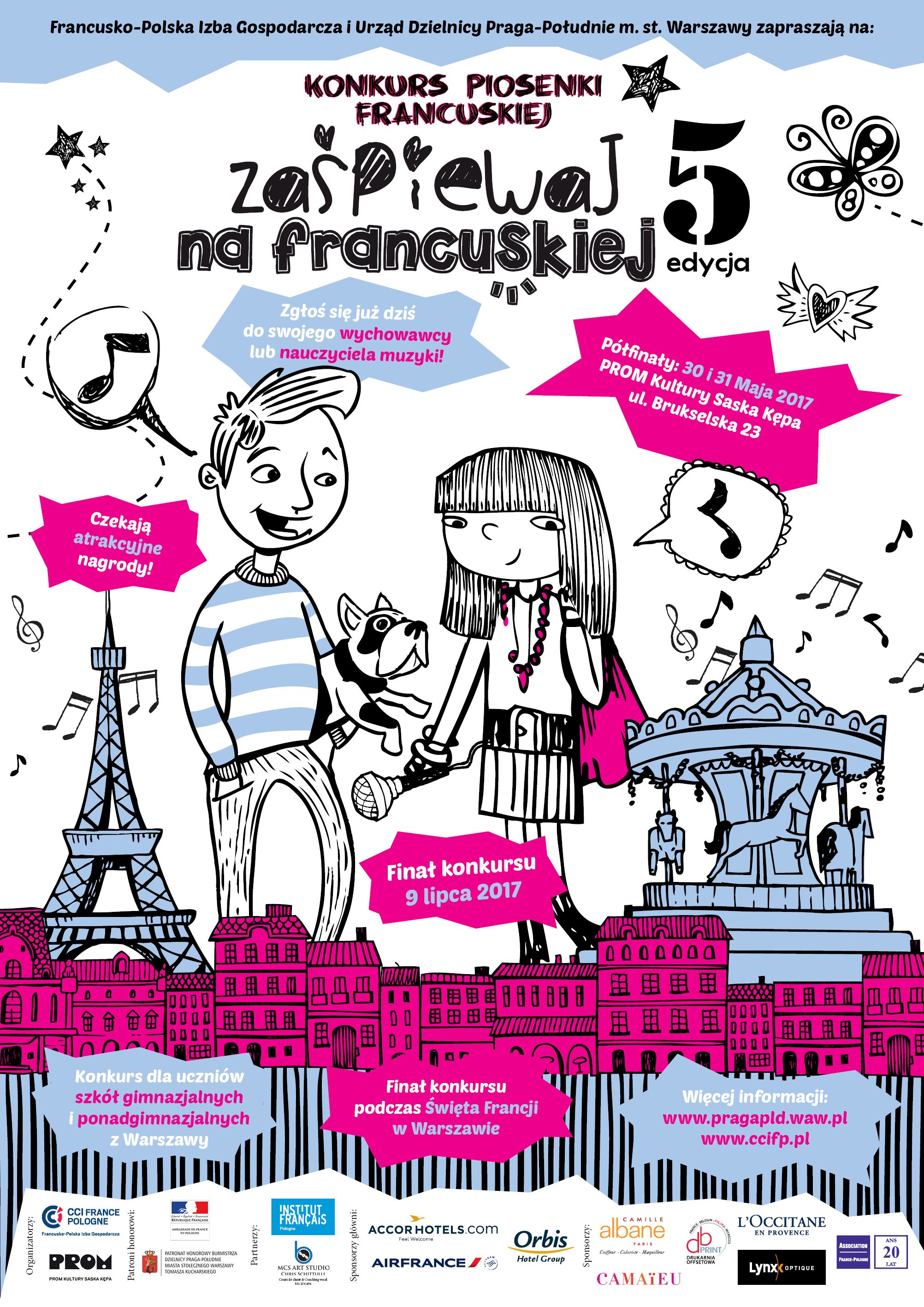 Le Concours de la Chanson Française, organisé par la Chambre de Commerce et d’Industrie France Pologne sous le patronage du Maire de Praga du Sud et de l’Ambassadeur de France en Pologne, et en coopération avec l’Institut Français de la Pologne, du PROM Kultury Saska Kępa et de Chris Schittulli (chanteur & coach vocal) dans le cadre de la ? Fête de la France ?, est destinée aux élèves des collèges et des lycées de Varsovie.