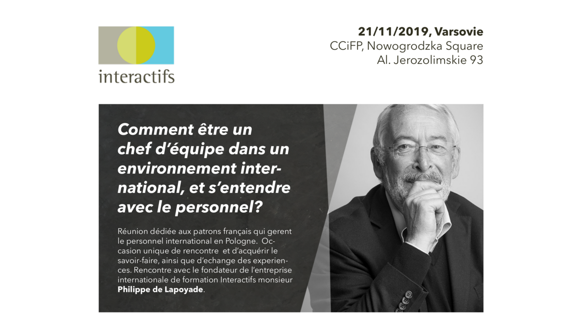 Réunion dédiée aux patrons français qui gerent le personnel international en Pologne. Occasion unique de rencontre et d’acquérir le savoir-faire, ainsi que d’echange des experiences. Rencontre avec le fondateur de l’entreprise internationale de formation Interactifs monsieur Philippe de Lapoyade.