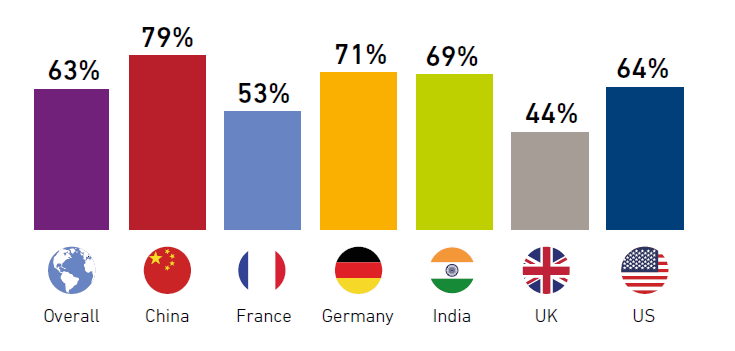 Connaissance des technologies: Les dirigeants chinois sont ceux qui ont la plus forte connaissance des cinq technologies (79%), suivis par l'Allemagne (71%), l'Inde (69%), et les Etats-Unis (64%). La France (53%) et le Royaume-Uni (44%) arrivent en queue de peloton.l'intelligence artificielle est la technologie que le plus de répondants connaissent.