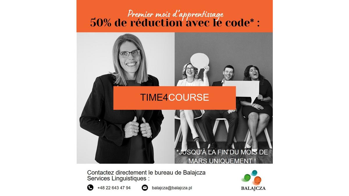 Il suffit de contacter le bureau de Balajcza et de mentionner le code (TIME4COURSE) et nous inclurons la réduction dans le devis.
