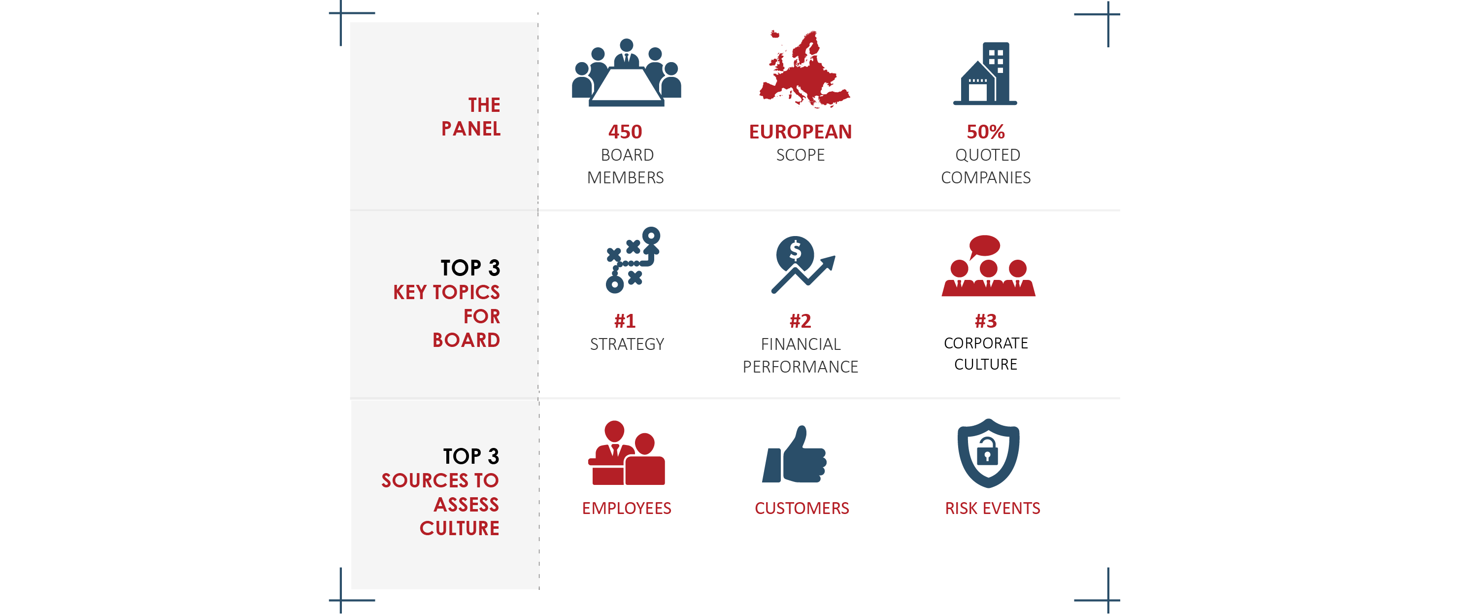 Dans l'ensemble, les constatations indiquent que même si la culture d'entreprise occupe une place centrale, les conseils d'administration n'ont pas encore trouvé la meilleure façon d'en faire un levier de croissance et qu'elle ne fait pas partie de principaux indicateurs de suivi de cette croissance.