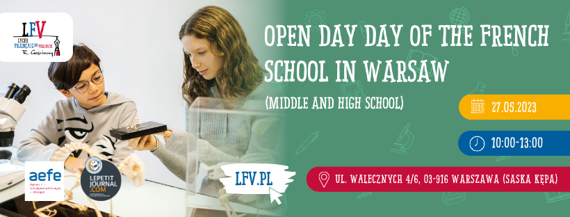 Ne manquez pas la Journée Portes Ouvertes du collège et lycée du LFV le samedi 27 mai 2023 ! Cette année, le Lycée français de Varsovie s'associe aux festivités de la Fête de quartier de Saska Kępa, ce qui permettra aux familles non seulement d'en apprendre plus sur l’établissement et ses atouts, mais aussi de découvrir le quartier très dynamique de Saska Kępa...