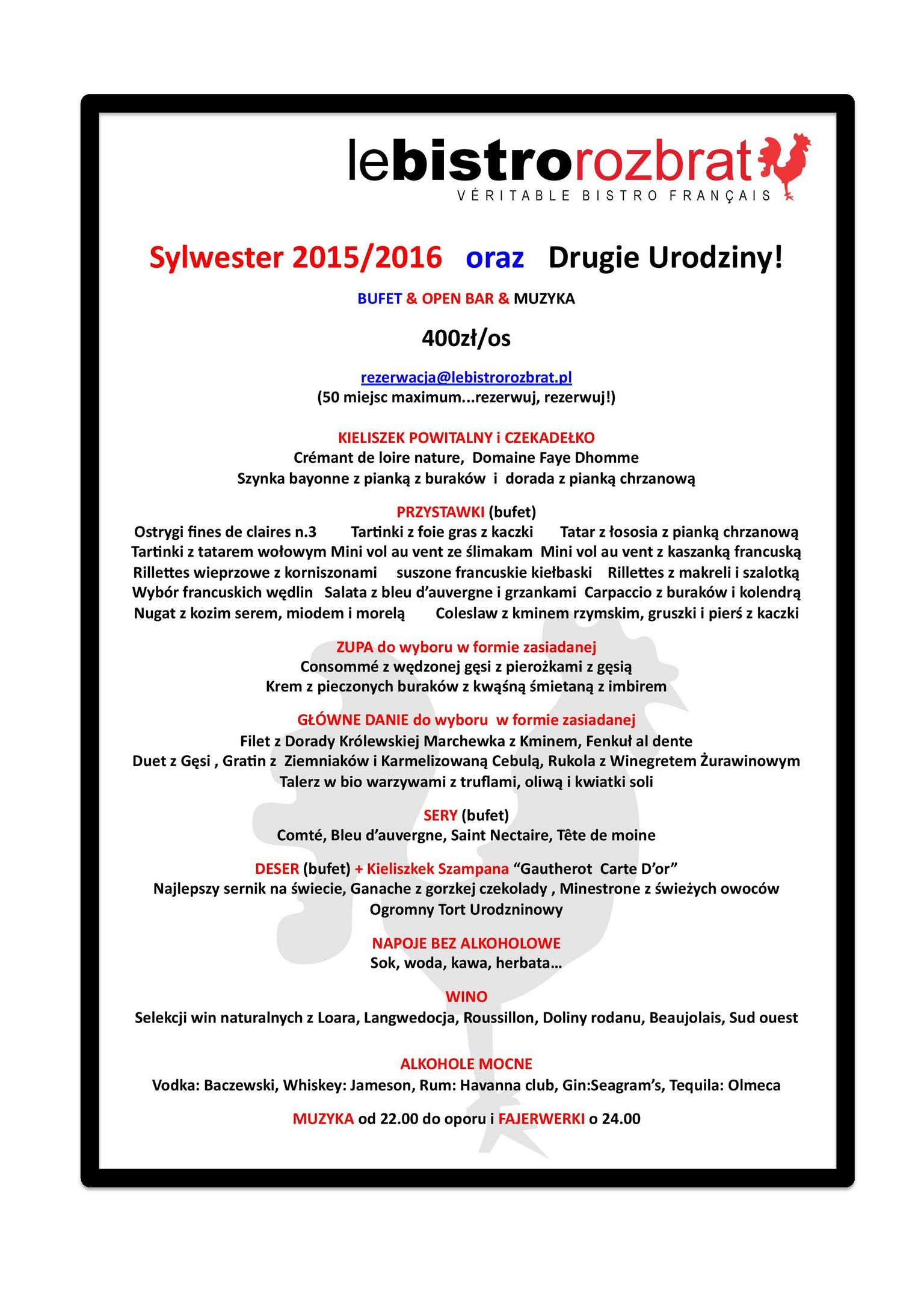 <p style="text-align: justify;">Nous vous invitons à la fête de la Saint Sylvestre au Bistro Rozbrat. Il ne manquera pas de plats excellents, de desserts exquis et de musique jusqu'à l'aube. La nuit de la Saint Sylvestre sera une occasion pour célébrer le deuxième anniversaire du bistro. </p>