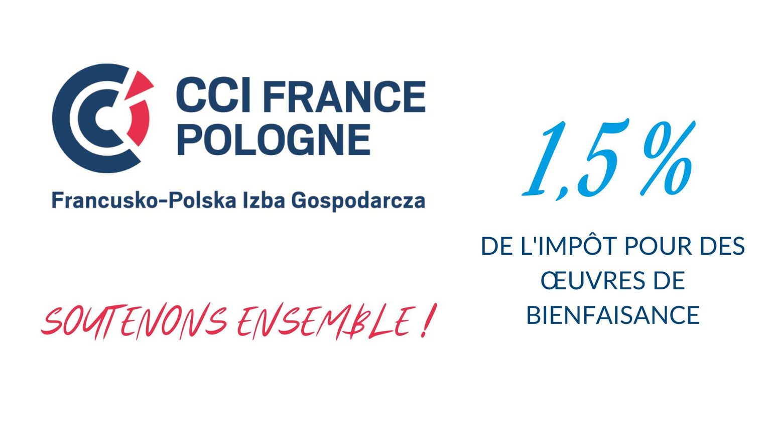 La Chambre de Commerce et d'Industrie France-Pologne lance, comme chaque année, la campagne "1,5% d'impôt pour la charité", dans le but de toucher un large éventail d'employés des entreprises membres et tous les destinataires de la newsletter de la Chambre, et ainsi les encourager à donner 1,5% de leur impôt sur leur déclaration d'impôt sur le revenu aux fondations que nous aurons désignées.
