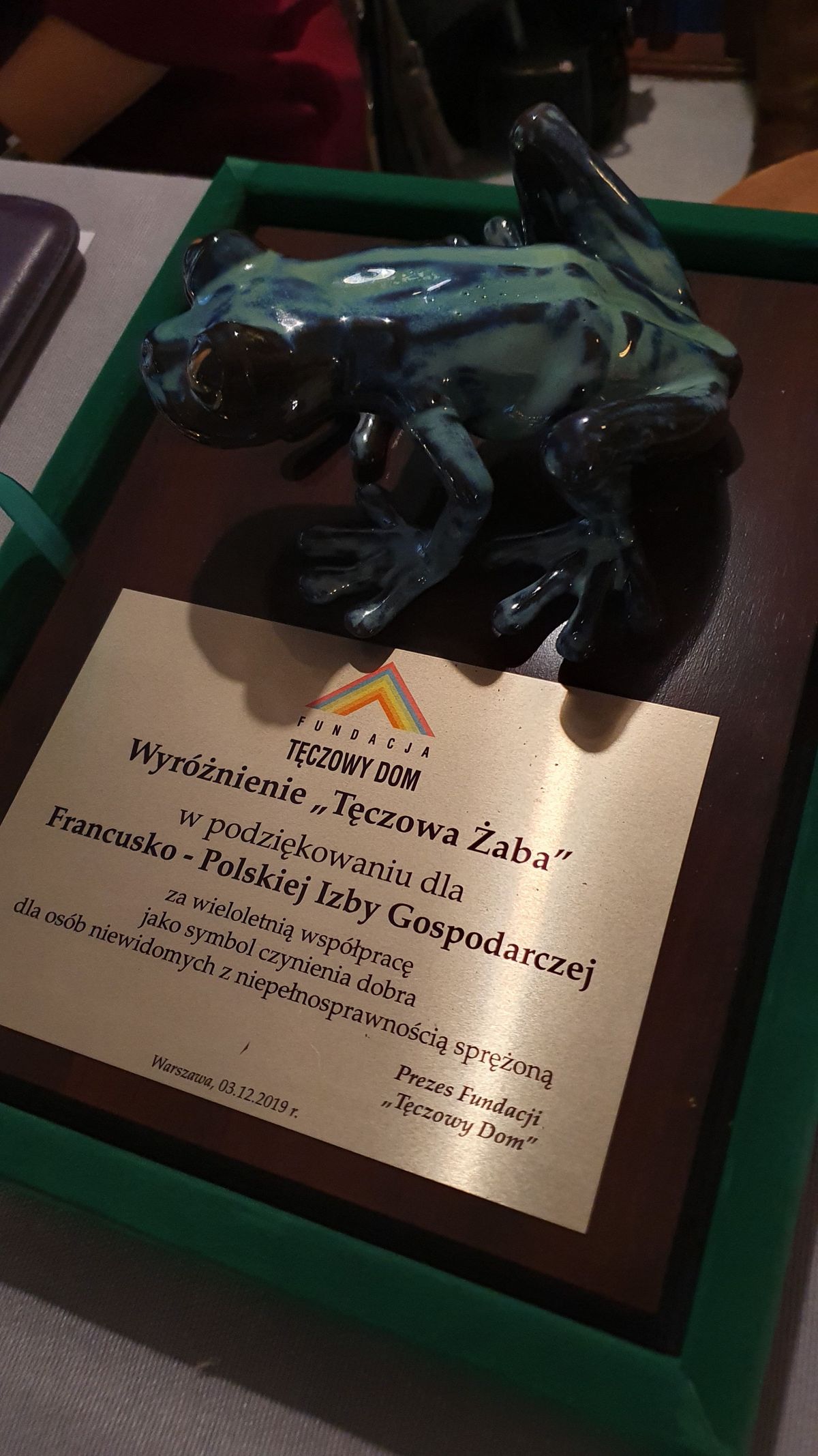 Lors du dernier RDV d’Affaires de cette année, qui a eu lieu le 3 décembre à Dom Towarowy Braci Jabłkowskich, la CCIFP a reçu de la Fondation « Tęczowy Dom » une statuette de la Grenouille arc-en-ciel. Il s'agit d'un prix décerné une fois par année par le conseil d'administration de la Fondation à une personne ou une entité qui soutient les activités de l'Association, comme symbole du bien faire. Cette fois, le prix a été décerné à la CCIFP pour son soutien à long terme aux activités de la Fondation.