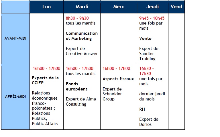 Elles se dérouleront au siège de la CCIFP, au centre de Varsovie, rue Widok 8 (7ème étage).