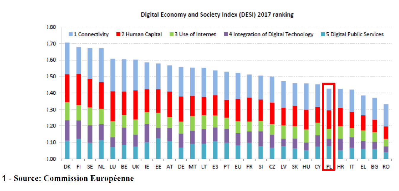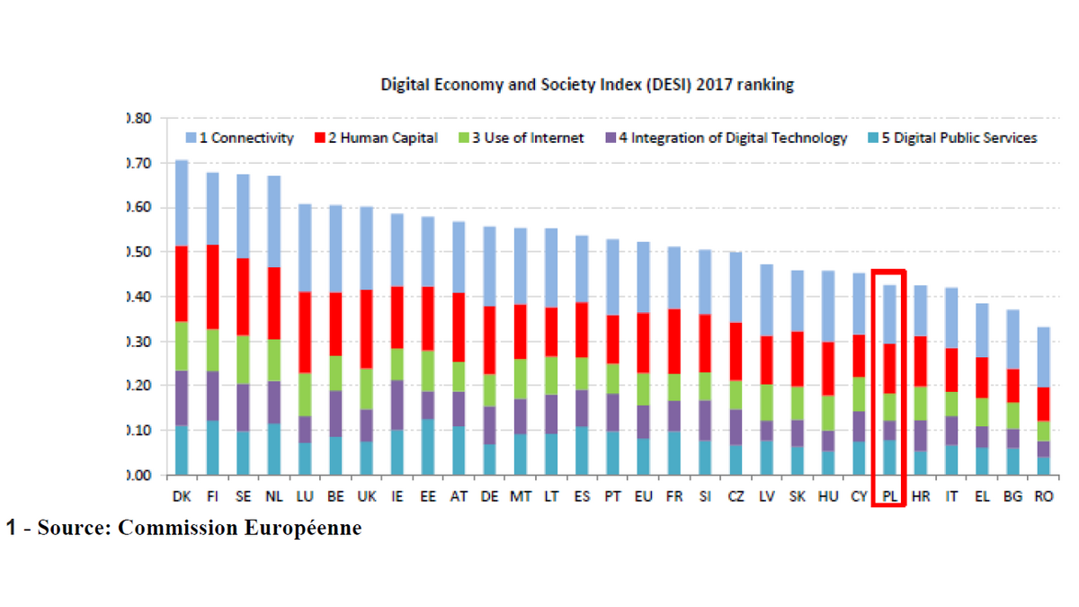 Pour l’indicateur de capital humain, la Commission souligne le nombre croissant d’utilisateurs polonais d’internet mais regrette le faible niveau de compétence numérique des polonais.