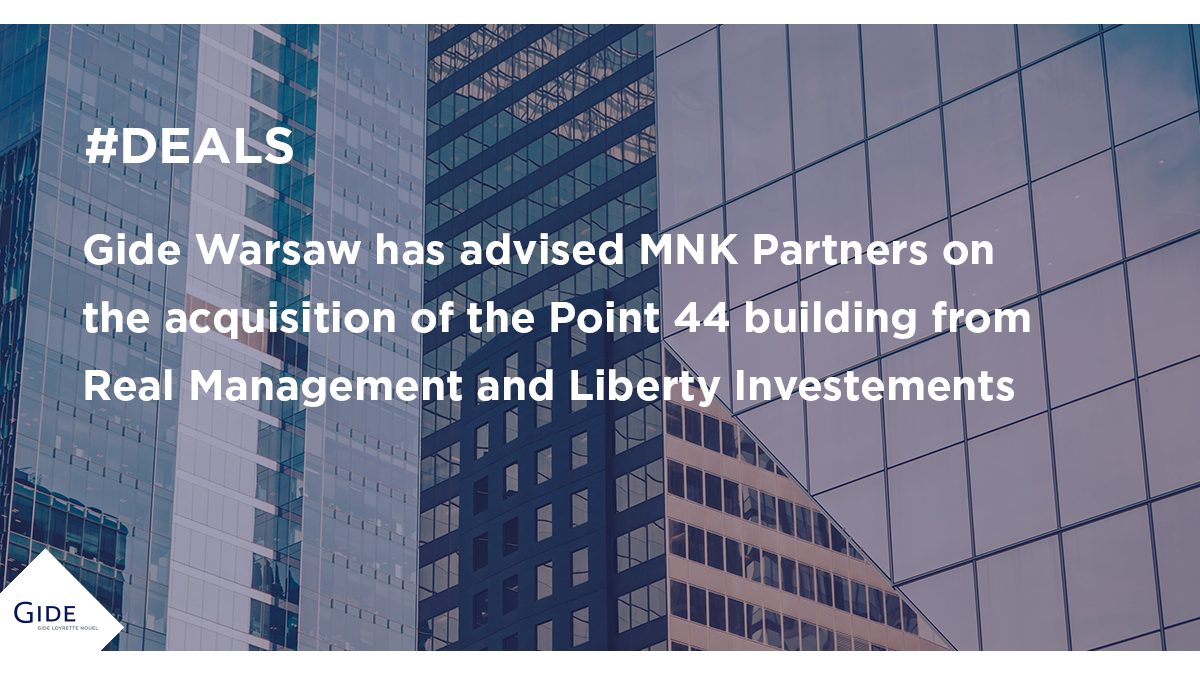 L'équipe de Gide a assisté MNK Partners à toutes les étapes de l'acquisition de l'immeuble Point 44 situé à Piaseczno, ul. Puławska 44D, auprès de Real Management et Liberty Investments, y compris notamment dans le cadre de la vérification préalable (due diligence) du bien immobilier, la négociation de la documentation transactionnelle et l'obtention du financement.