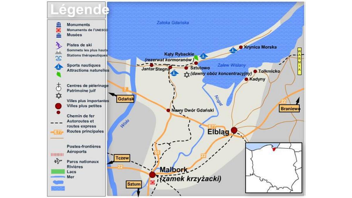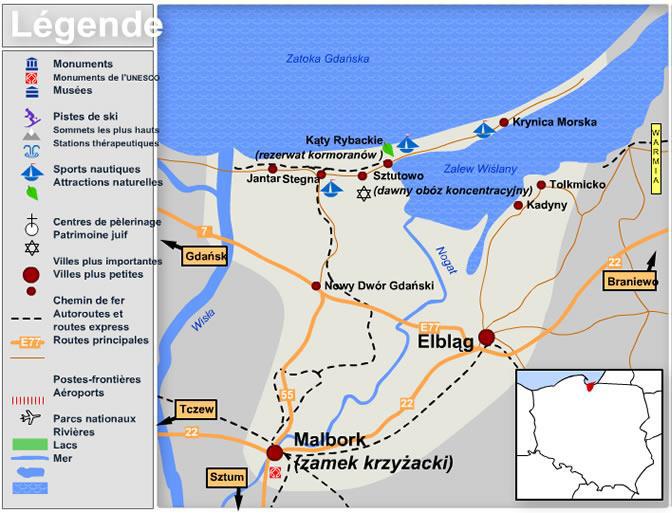 <p style="text-align: justify;">La presqu'île de la Vistule (en polonais: Mierzeja Wiślana) est un cordon littoral qui sépare la baie de Gdańsk de la lagune de la Vistule. La presqu'île appartient côté sud-ouest à la Pologne et côté nord-est à la Russie (région de Kaliningrad). Jusqu'au XIIIe siècle, la presqu'île pouvait être traversée par les bateaux via des canaux et ainsi la ville polonaise d'Elbląg bénéficiait d'un accès maritime direct à la mer Baltique. Vers la fin du XIIIe siècle, les canaux de la presqu'île se sont obstrués naturellement et Elbląg a perdu son statut de port maritime.</p>