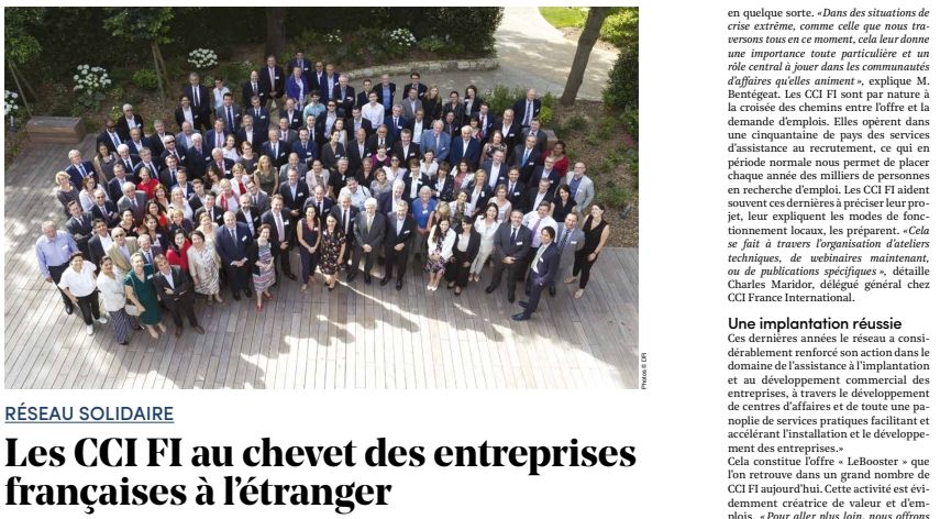 Nous avons le plaisir de vous communiquer cet article sur le réseau des CCI FI, qui valorise bien les actions des CCI FI sur la période récente, traite de l’impact de la crise sur le réseau et sur les entrepreneurs français de l’étranger, tout en transmettant une dynamique positive, avec des ouvertures faites vers les Pouvoirs publics français, pour un soutien plus marqué à nos organisations.