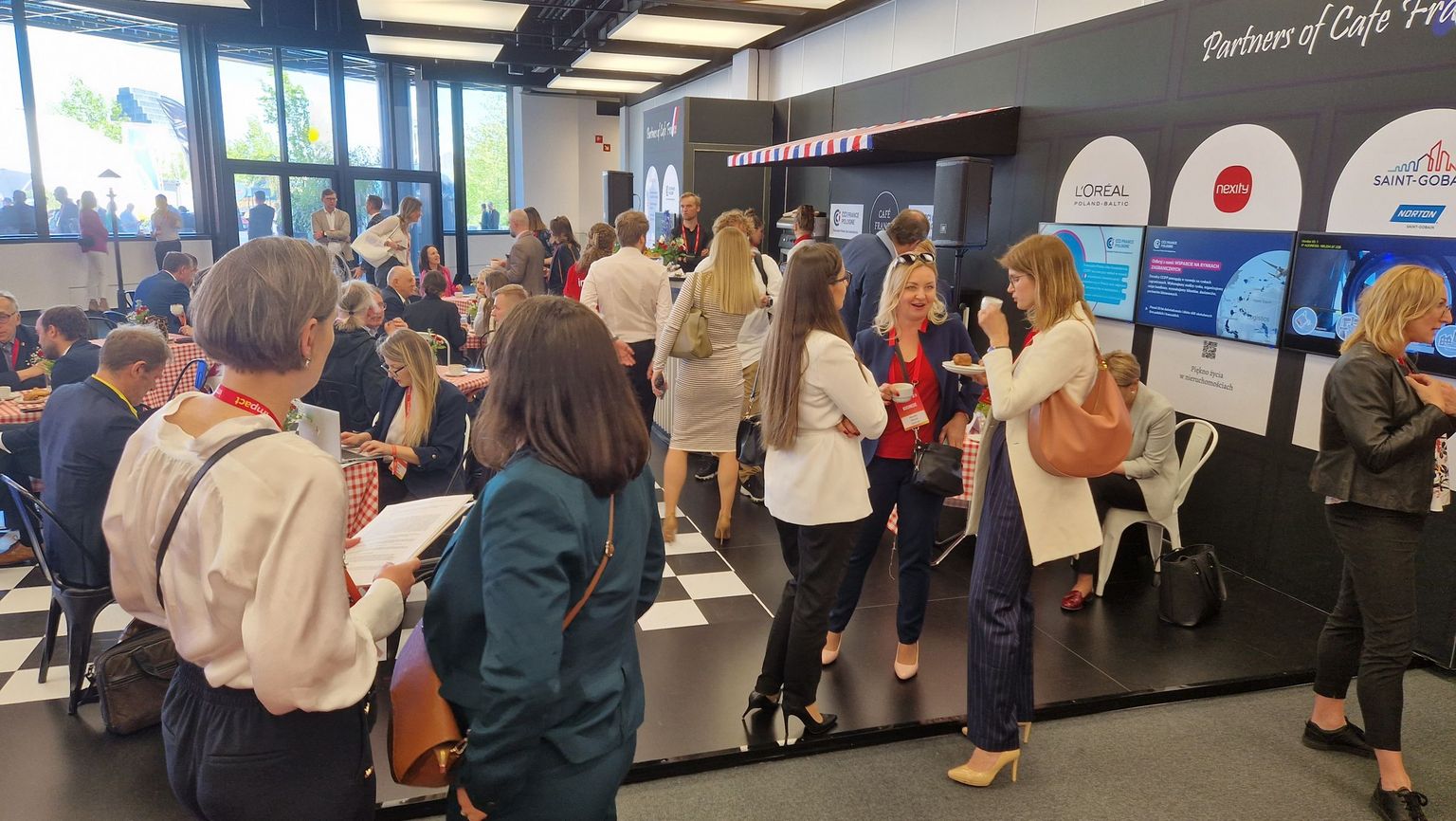 Parmi les nombreux exposants et intervenants, la CCIFP était également présente, avec ses partenaires : L'Oréal Pologne et Pays Baltes, Saint-Gobain avec sa marque Saint-Gobain Norton et Nexity Pologne. Notre espace Café France, lieu de rencontre autour d'un délicieux café et de croissants, mais aussi de promotion de nos entreprises et du partenariat économique franco-polonais, a été l'un des lieux les plus fréquentés tout au long de l'événement. Sur les deux jours, nous avons servi plus de 1 500 cafés et 1 600 croissants cuits sur place, et les tables de notre zone ont été occupées du début de la matinée jusqu'au soir. La musique française, l'ambiance, l'opportunité de rencontrer des représentants de nos partenaires et d'autres invités de marque, dont Miron Mironiuk, Paweł Borys, président de PFR, Jadwiga Emilewicz, ancien ministre du développement, les recteurs de SGH ou de l'Université Kozminski, ont déterminé le caractère unique de notre espace CAFE FRANCE.