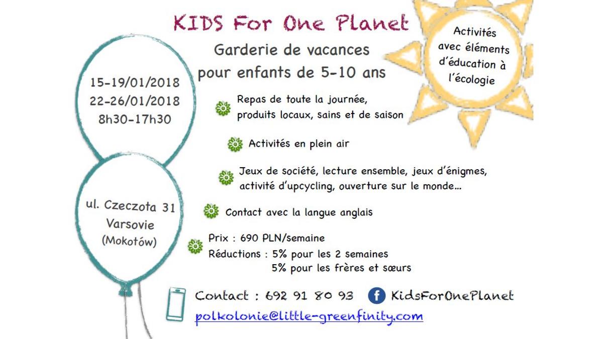 <p style="text-align: justify;">Little Greenfinity, avec la Fondation One Planet, propose la <strong>première garderie de vacances avec des éléments d’éducation à l’écologie pour les enfants de 5 à 10 ans</strong> : Kids For One Planet. La garderie se tiendra pendant les vacances d’hiver polonaises <strong>du 15 au 26 janvier 2018 à Varsovie (Mokotów). </strong></p>