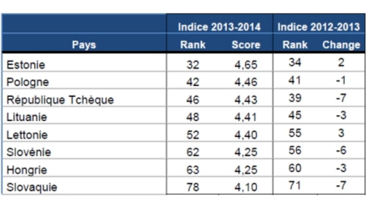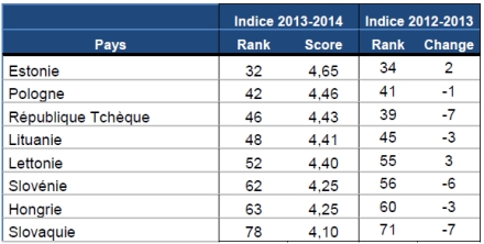 Ainsi l'Estonie et la Lettonie voient leur classement s'améliorer légèrement (de 2 et 3 rangs, respectivement) tandis que les autres pays enregistrent un recul. Les dégradations les plus importantes concernent la République tchèque (cf. infra) et la Slovaquie.