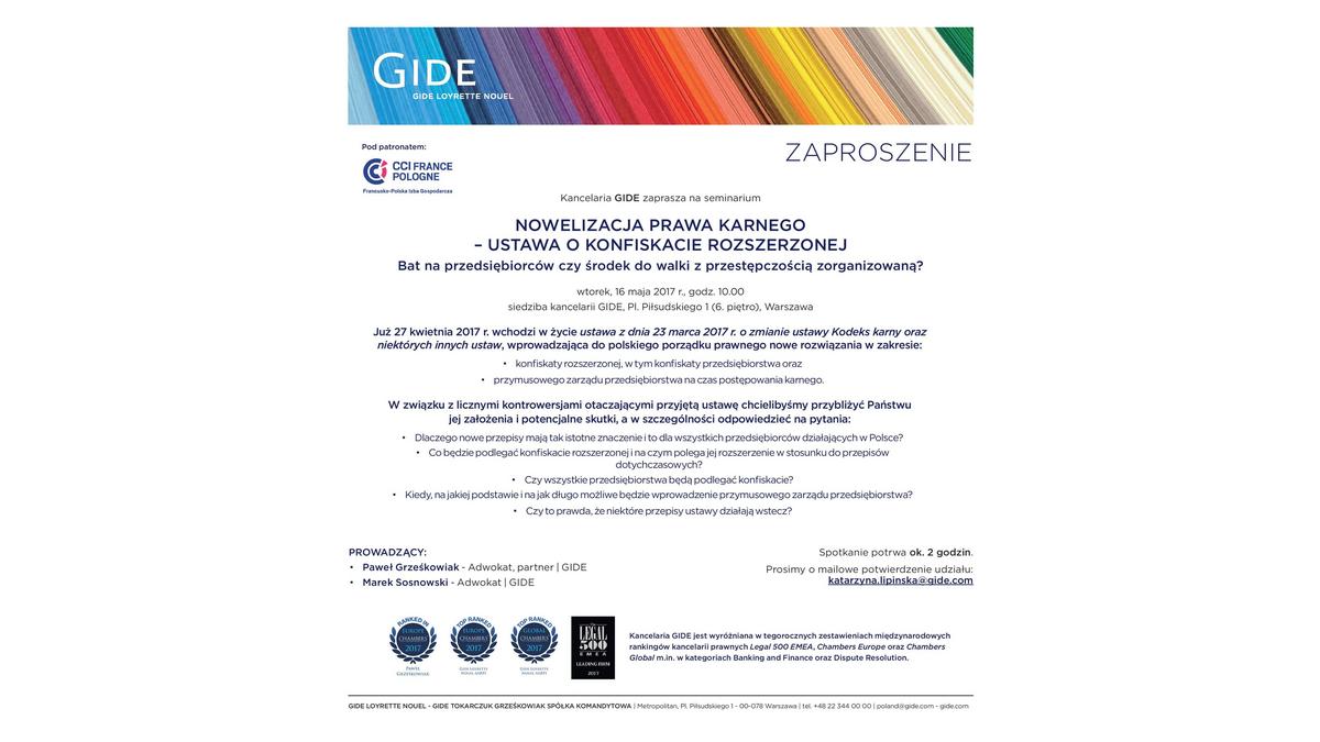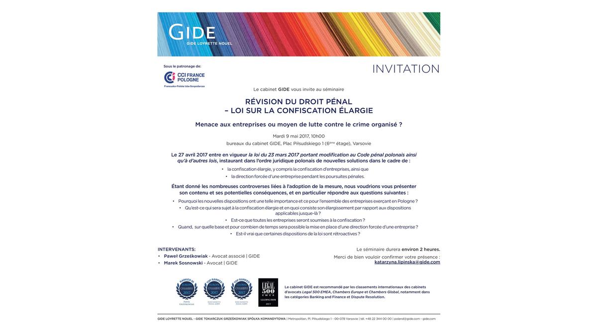 <p style="text-align: justify;">Le cabinet Gide vous invite au séminaire <strong>«</strong> <strong>Révision du droit pénal - Loi sur la confiscation élargie - Menace sur les entreprises ou moyen de lutte contre le crime organisé ?</strong> <strong>»</strong>, qui se tiendra le 9 mai 2017 à 10h00 dans les locaux du Cabinet.</p>