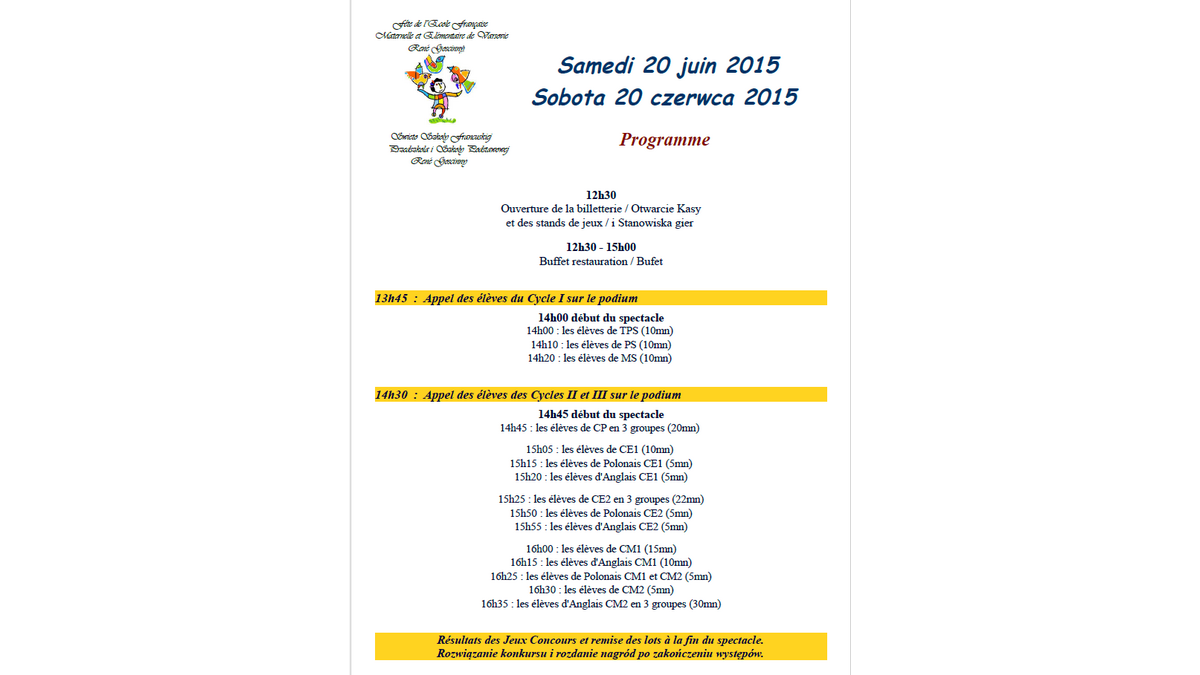 <p style="text-align: justify;">Animations, stands de jeux, spectacles des enfants, expositions et buffets de restauration et de boissons vous attendent. Billets en vente dans le hall de l’école de Sadyba à 8h30, 14h30 et 15h30, tous les jours et jusqu’au vendredi 19 juin.</p>