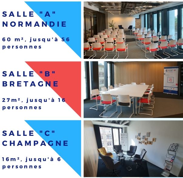 Dans le cadre de la cotisation standard et du partenariat financier, nous mettons à votre disposition une salle moyenne - BRETAGNE, qui peut accueillir jusqu'à 16 personnes. Les petites entreprises bénéficiant de tarifs réduits peuvent louer gratuitement la petite salle - CHAMPAGNE (jusqu'à 6 personnes). Les partenaires stratégiques peuvent utiliser la salle moyenne ou grande - NORMANDIE (jusqu'à 56 personnes).