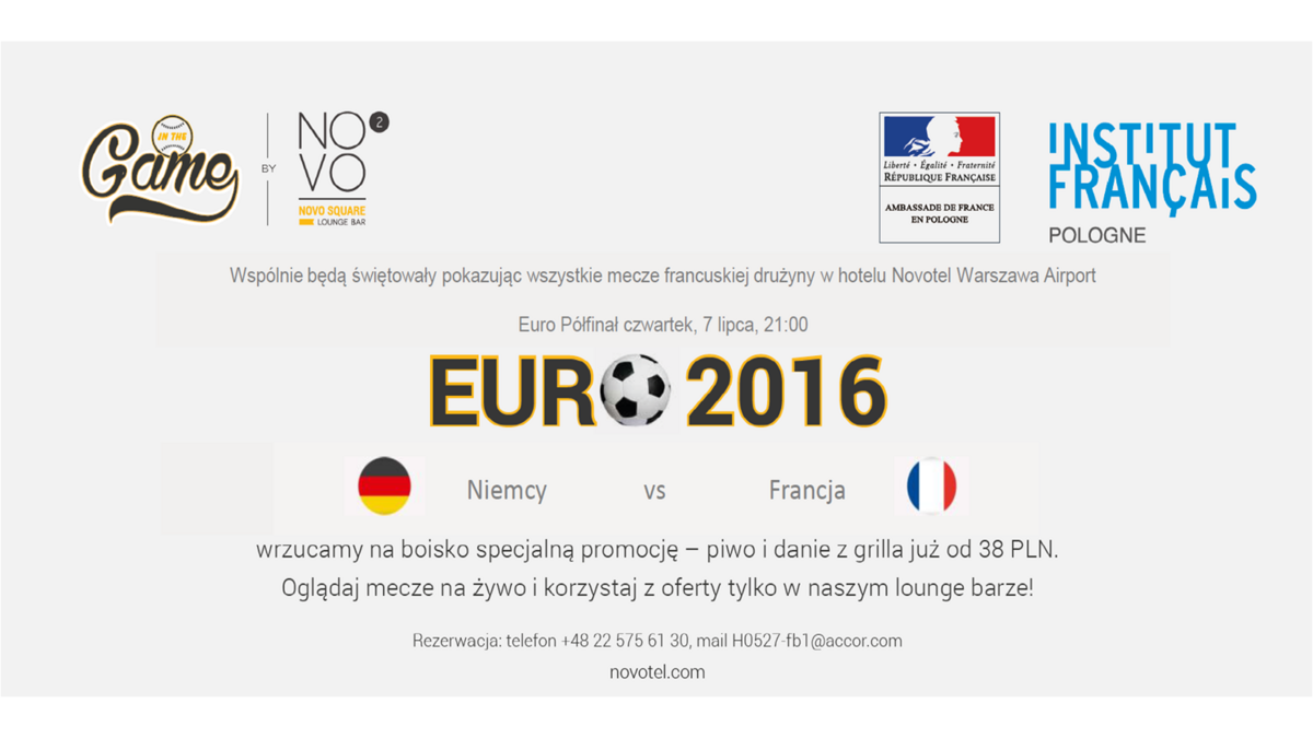 <p style="text-align: justify;">Sont associés pour célébrer l'EURO 2016 et visionner les matchs de l'Equipe de France à l'Hôtel Novotel Warszawa Airport. 7 juillet, à 21h à Marseille, Allemagne - France. Bière (Grande) et Grillades à partir de 38 PLN. Venez et profitez de voir les matchs en Live sur Grande Ecran. Offre valabe dans notre Lounge Bar & Jardin!</p>