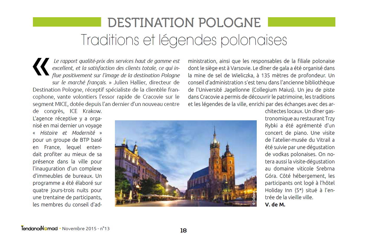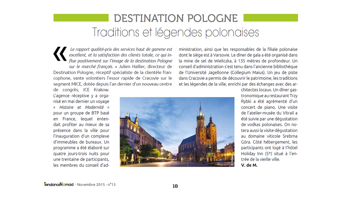 <p style="text-align: justify;">Le rapport qualité-prix des services haut de gamme est excellent, et la satisfaction des clients totale, ce qui influe positivement sur l'image de la destination Pologne sur le marché français. » Julien Hallier, directeur de Destination Pologne, réceptif spécialiste de la clientèle francophone, vante volontiers l’essor rapide de Cracovie sur le segment MICE, dotée depuis l’an dernier d’un nouveau centre de congrès, ICE Krakow.</p>