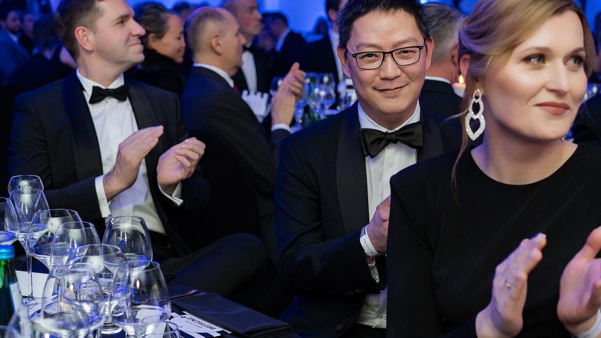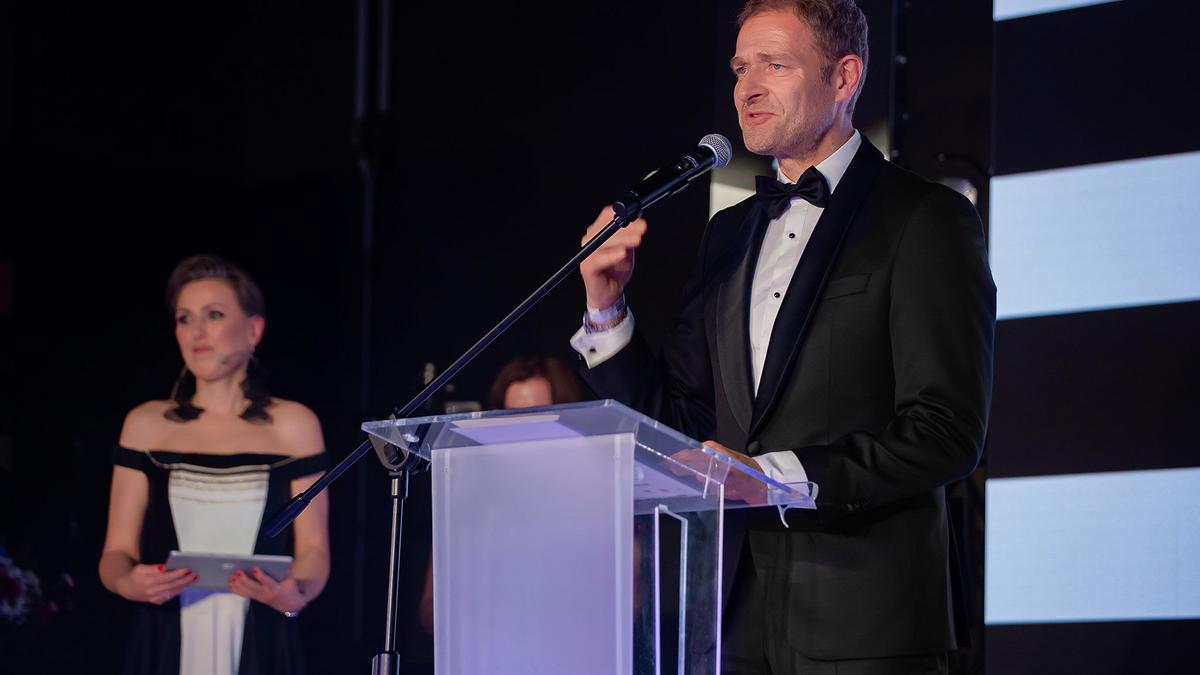 Les maîtres de cérémonie étaient la Directrice Générale de la CCIFP, Joanna Jaroch-Pszeniczna, et Pascal Brodnicki, célèbre chef et auteur de livres culinaires. La soirée a été inaugurée par Valéry Gaucherand, Président de la CCIFP et Président de L'Oréal Pologne et Pays Baltes, qui a souligné l'importance du partenariat économique franco-polonais. Il a rappelé que la France est le deuxième investisseur étranger en Pologne et que les entreprises à capitaux français représentent 5 % de l'ensemble des investissements dans le secteur des entreprises. Il a également présenté trois axes stratégiques pour la CCIFP dans l'année à venir : la compétitivité de l'économie européenne, l'innovation et le développement durable. Il a adressé des remerciements particuliers à Tareck Ouaibi, Président sortant de la CCIFP, en lui remettant des fleurs sur scène.