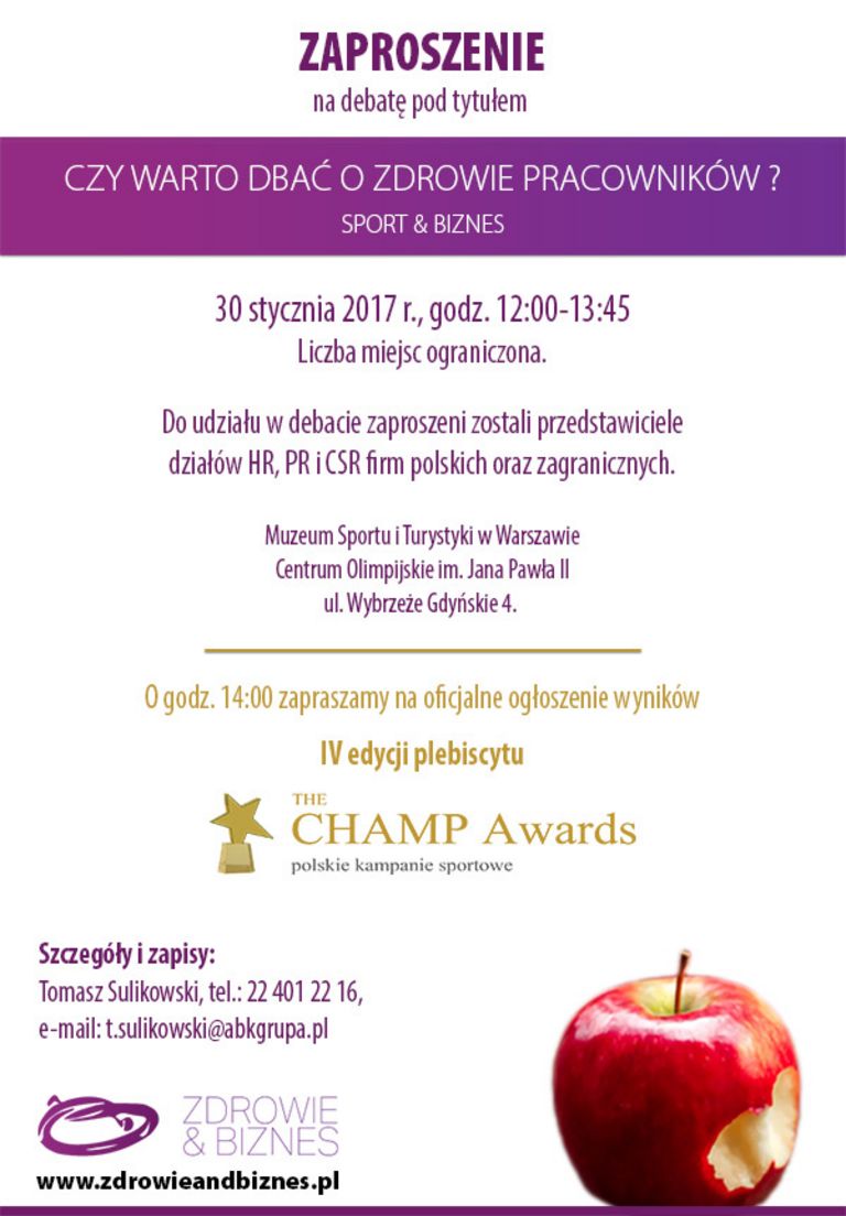 Zaproszenie na debatę "Sport & Biznes - czy warto dbać o zdrowie pracowników?" organizowaną 30 stycznia 2017 w Muzeum Sportu i Turystyki w…