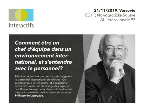 Réunion dédiée aux patrons français qui gerent le personnel international en Pologne. Occasion unique de rencontre et d’acquérir le savoir-faire, ainsi que d’echange des experiences. Rencontre avec le fondateur de l’entreprise internationale de formation Interactifs monsieur Philippe de Lapoyade.