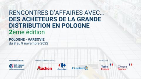 La Chambre de Commerce et d'Industrie France Pologne vous propose un programme de rendez-vous d'affaires et tables-rondes thématiques visant à promouvoir vos activités auprès des grands distributeurs en Pologne. Nous vous convions donc à la 2ème éditions des "Rencontres Acheteurs avec la grande distribution en Pologne" qui aura lieu le 8 et 9 novembre 2022.
