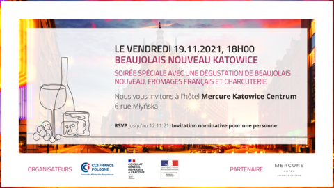 Pendant la soirée, comme le veut la tradition, nous déboucherons les premières bouteilles du Beaujolais Nouveau et nous aurons l’occasion de se réunir autour d’un verre de vin jeune et léger. Nous vous proposerons non seulement une dégustation et mais aussi des discussions dans le cadre de la communauté franco-polonaise autour des organisateurs : Chambre de Commerce et d’industrie France-Pologne, Consulat Général de France à Cracovie, Consulat Honoraire de France à Katowice et Maison de la Ville de Saint-Étienne à Katowice.