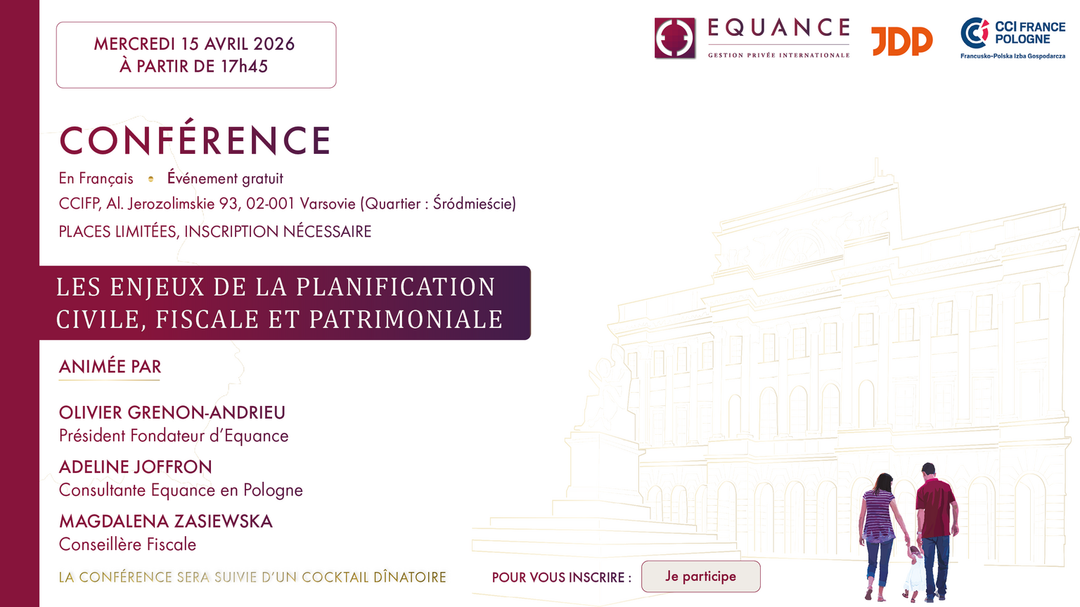 Le 15 avril 2026 à 17h45, Equance organise à la Chambre de Commerce et d’Industrie France-Pologne une conférence consacrée aux enjeux de la planification civile, fiscale et patrimoniale. Les intervenants partageront leurs analyses et apporteront des éclairages concrets sur les défis liés à l’organisation, la gestion et la transmission du patrimoine dans un environnement juridique et fiscal en constante évolution.