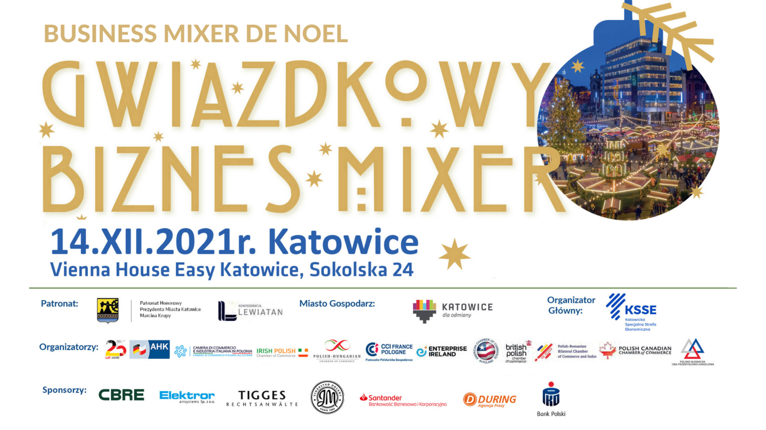 La Chambre de Commerce France Pologne en coopération avec la Zone Economique Spéciale de Katowice, Konfederacja Lewiatan et les Chambres Bilatérales en Pologne vous invite cordialement au Christmas Business Mixer, qui aura lieu le 14 décembre 2021 de 18h00 à 21h00 à l'hôtel Vienna House Easy à Katowice.