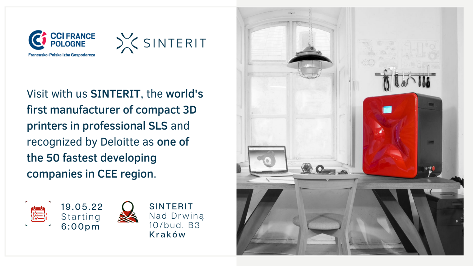 We invite you to participate in an exceptional meeting with Sinterit, a leader of innovative solutions for 3D printing. The event will take place on Thursday, May 19 at 18.00 at the headquarters of Sinterit (Nad Drwina 10/bud. B3, 30-741 Kraków).