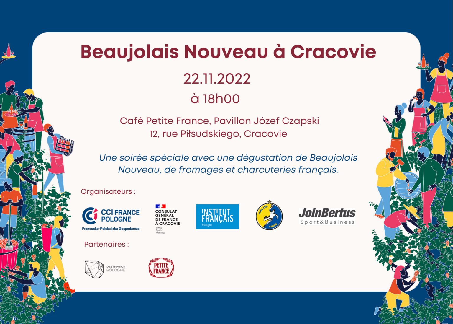 Rejoignez-nous pour une célébration unique du Beaujolais Nouveau. En collaboration avec nos partenaires, nous vous préparons une foule d'attractions dans le plus pur style parisien. Le lieu unique du Café Petit France au Pavillon Czapski à Cracovie deviendra une fois de plus le lieu de rencontre autour des verres de Beaujolais Nouveau pour tous les Français et les amoureux de la France à Cracovie.