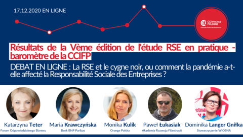 Nous vous invitons à un événement ON-LINE unique. Juste avant la fin de l'année, nous connaîtrons les résultats de la cinquième édition de l'enquête "Le baromètre de la CCIFP - la RSE en pratique". C'est la seule enquête cyclique en Pologne qui montre le niveau d'implication des entreprises dans les activités de la RSE. Nous découvrirons ensemble, entre autres :