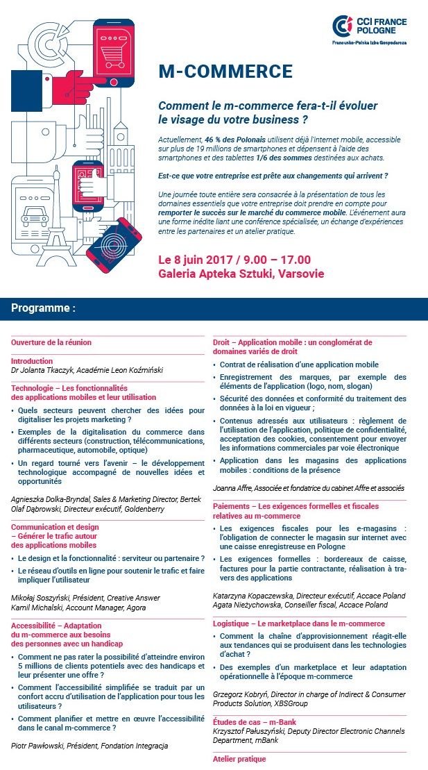 Tarif : 750 PLN pour les employés des sociétés membres de la CCIFP d'autres chambres bilatérales-partenaires, 990 PLN pour les non membres