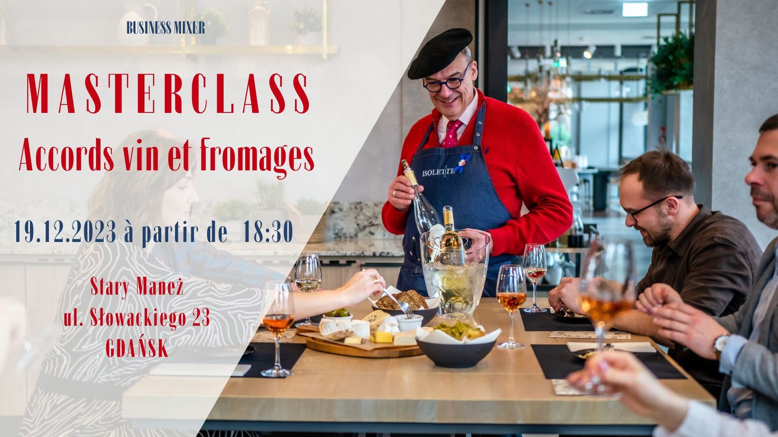 Rejoignez-nous pour un business mixer autour de la gastronomie française avec une masterclass « Accords vin et fromages » : le mardi 19 décembre, à partir de 18h30 à Stary Maneż (ul. Słowackiego 23, Gdańsk).