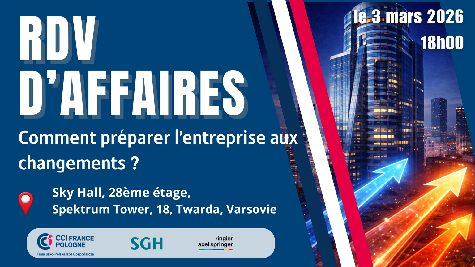 Rencontre gratuite pour les entreprises membres de la CCIFP. Entreprises non adhérentes : 350 PLN – paiement en ligne possible (détails en bas de page).