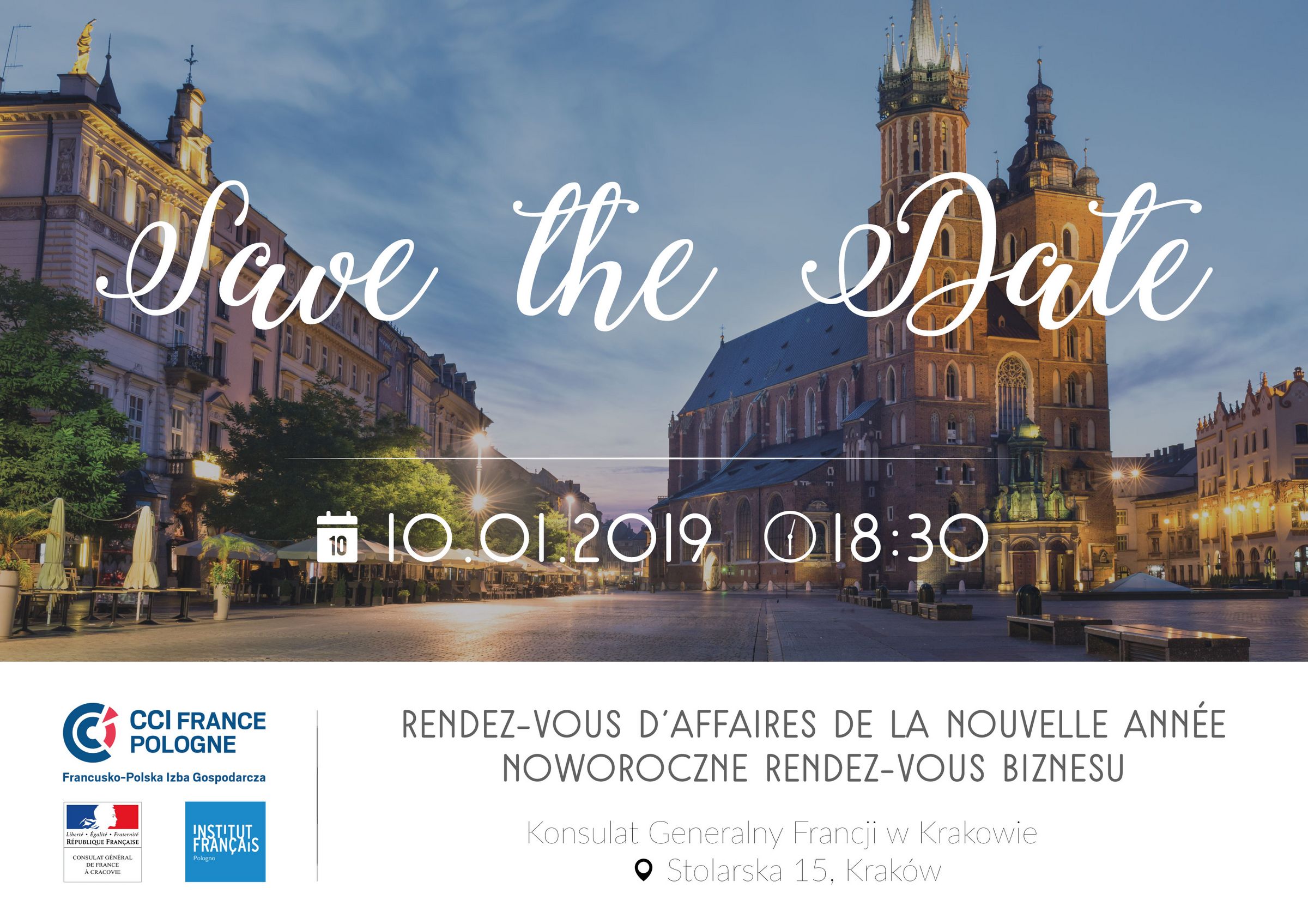 La CCIFP en collaboration avec le Consulat général de France ? Cracovie et l’Institut Français invite ? la première édition du Rendez-vous d'affaires ? Cracovie. À cette occasion, la Directrice de la CCIFP, Monika Constant, le Consul Général de France ? Cracovie, Frédéric de Touchet et le Délégué régional de la CCIFP pour Cracovie et Katowice, Julien Hallier présenteront leurs meilleurs vœux pour la nouvelle année ainsi que le calendrier des événements 2019.