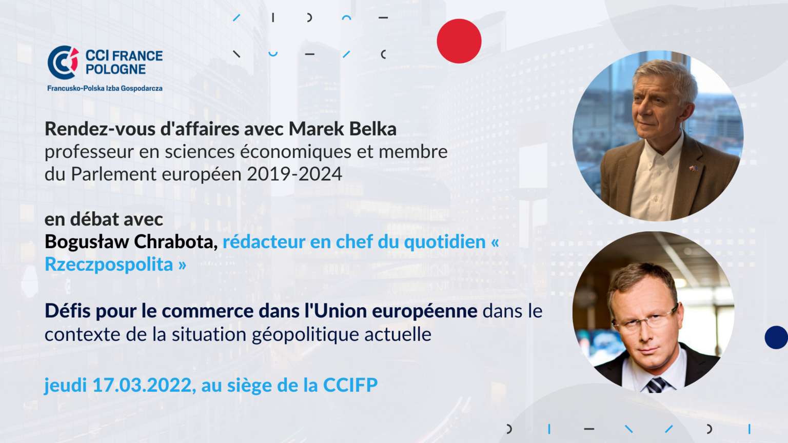 Au cours de la rencontre du cycle « Rendez-vous d'affaires » en mois de mars, nous vous invitons à un débat avec le professeur Marek Belka, économiste, ancien Premier ministre et ministre des finances, animé par Bogusław Chrabota, rédacteur en chef du quotidien « Rzeczpospolita ». Le dialogue portera sur les défis actuels de l'Union européenne dans le domaine du commerce, dans le contexte de la situation géopolitique présente et du conflit en Ukraine.