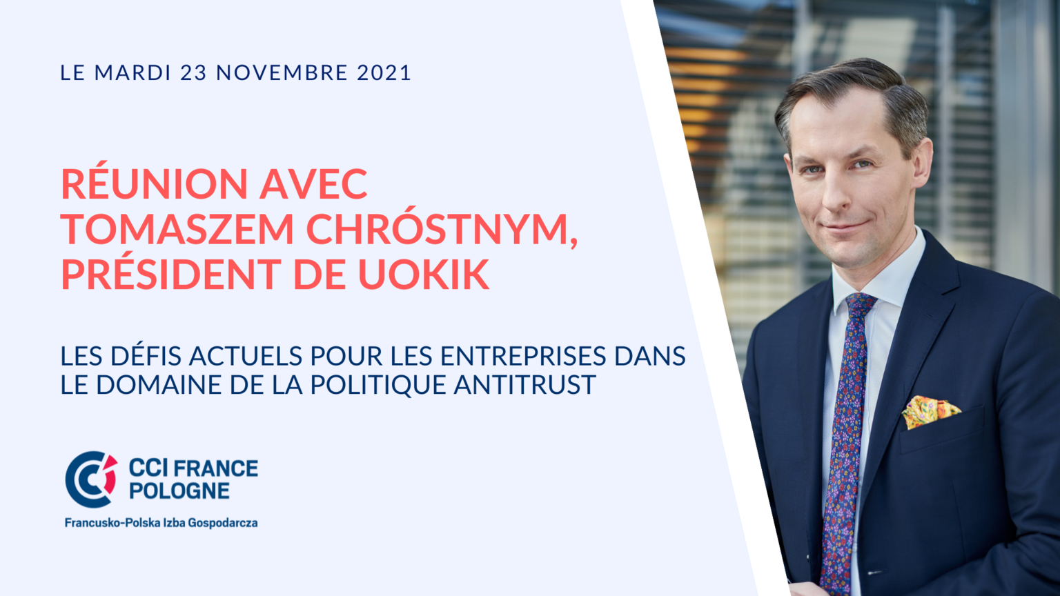Nous aimerions vous inviter à une réunion avec Tomasz Chróstny, président de l'Office de la concurrence et de la protection des consommateurs, concernant les défis actuels pour les entreprises dans le domaine de la politique antimonopole et de la politique de protection des consommateurs.