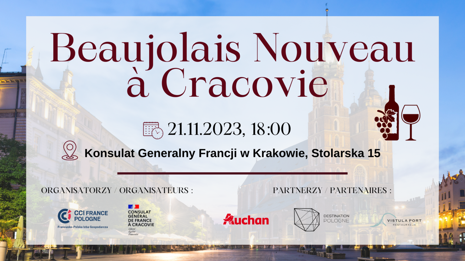 La Chambre de Commerce et d’Industrie France Pologne, le Consulat Général de France à Cracovie, et l’Institut français de Pologne ont le plaisir de vous inviter à la célébration de l’arrivée du Beaujolais Nouveau, qui se déroulera le mardi 21.11.2023 à 18h au Consulat Général de France à Cracovie (Stolarska 15).