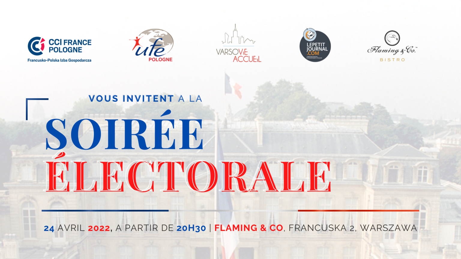 Nous vous invitons à partir de 20h30 au Bistro Flaming & CO., au 2 rue Francuska à Varsovie, où, en compagnie de Français vivant en Pologne, ainsi que d'amoureux de la France et de représentants des entreprises associées, nous suivrons en direct les premiers résultats des scrutins.
