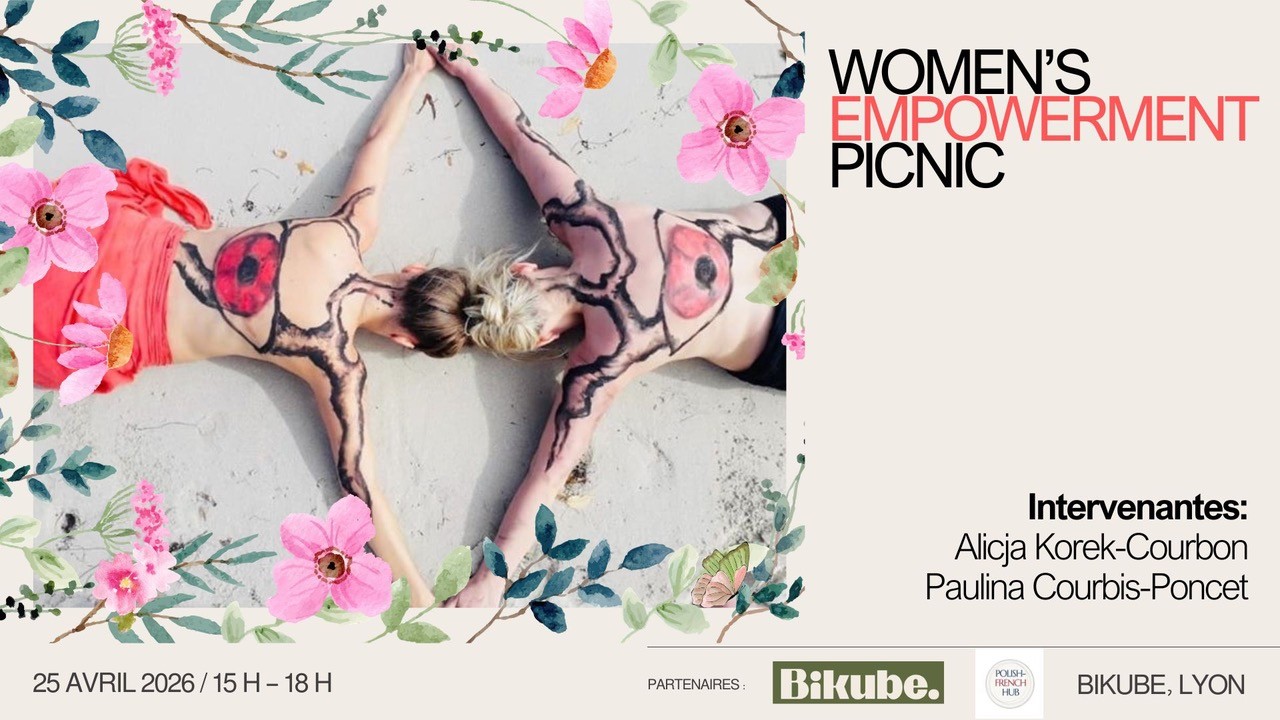 WOMEN’S EMPOWERMENT PICNIC est un atelier immersif de 3 heures qui inaugure une série d’expériences d’empowerment pour les femmes à travers l’Europe, et peut-être même au-delà. Pensé comme un projet itinérant, il a pour ambition de créer des espaces de transformation dans plusieurs lieux et géographies. L’idée est simple : Alicja Korek-Curbon, consultante et formatrice en Diversité, Équité & Inclusion et conceptrice de la Careformance (« care » + performance), invite à la co-création de chaque session une femme experte dans son domaine (business, santé, finance, environnement, technologie, …). Cet atelier combine pratiques artistiques, conscience corporelle, développement de l’estime de soi et réflexion collective, et s’adresse à toutes les femmes, de tous âges, origines et horizons. La première session aura lieu le 25 avril à Lyon, avec l’invitée spéciale Paulina Courbis-Poncet, spécialiste en stratégie, confiance et leadership authentique. En partenariat avec Polish-French Hub et Bikube Lyon.