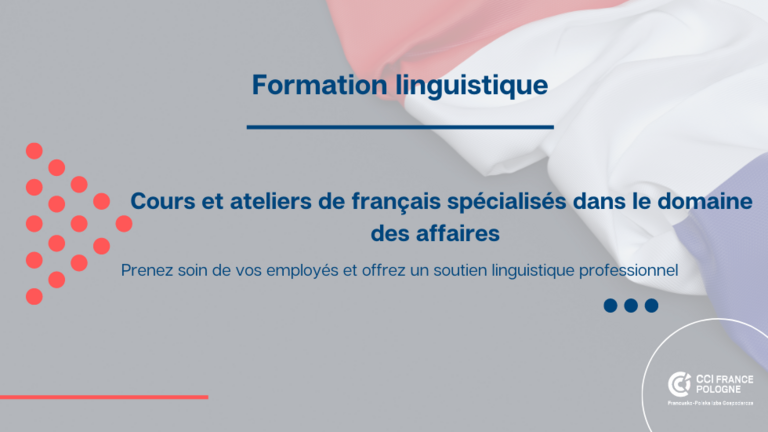 Une formation de langue française pour les entreprises. Il s'agit de cours uniques et de courtes sessions de formation dédiés aux employés des entreprises en Pologne, leur permettant d'acquérir des compétences linguistiques et communiquer plus efficacement dans un environnement francophone . Les cours proposés peuvent être d'une durée d'un an, offerts aux employés dans le cadre de leurs avantages sociaux. Les cours peuvent être individuels ou collectifs, ainsi que sous forme d'ateliers linguistiques plus courts, par exemple en matière de communication écrite par courrier électronique.