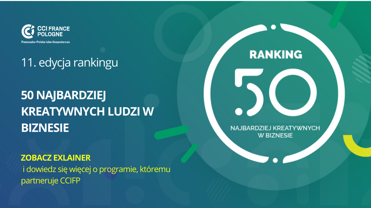 50. Najbardziej Kreatywnych Ludzi w Biznesie to całoroczny program, którego podstawę stanowi wymiana wiedzy, doświadczeń i możliwości biznesowych na kilku płaszczyznach. Organizatorów i laureatów rankingu wspiera Francusko-Polska Izba Gospodarcza, która już po raz kolejny ma zaszczyt być Partnerem rankingu.