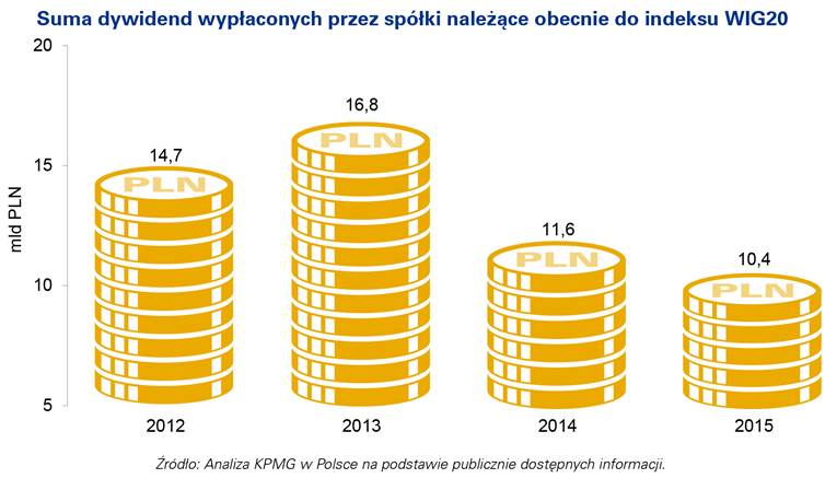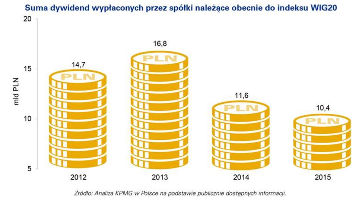 Do 30 czerwca 2016 roku odbyła się większość walnych zgromadzeń akcjonariuszy spółek giełdowych, na których zapadły ostateczne decyzje o podziale zysków za 2015 rok. Zgodnie z wyliczeniami KPMG w Polsce, 166 krajowych spółek z GPW wypłaci w sumie 16,8 mld zł, co w odniesieniu do ich kapitalizacji na koniec 2015 roku przekłada się na stopę dywidendy w wysokości 3,3%. Pomimo wzrostu liczby przedsiębiorstw dziel?cych się zyskiem, ł?czna wartość zadeklarowanych dywidend jest podobna jak przed rokiem (również 16,8 mld zł) oraz niższa niż w latach 2011-2013 (17,5 mld zł - ? ? 20,8 mld zł). Przyczyn? spadku s? cięcia dywidend wśród spółek należ?cych do indeksu WIG20, które wypłac? z zysku za 2015 rok w sumie 10,4 mld zł, tj. o 11% mniej niż w ubiegłym roku i 21% poniżej poziomu z 2013 roku.
