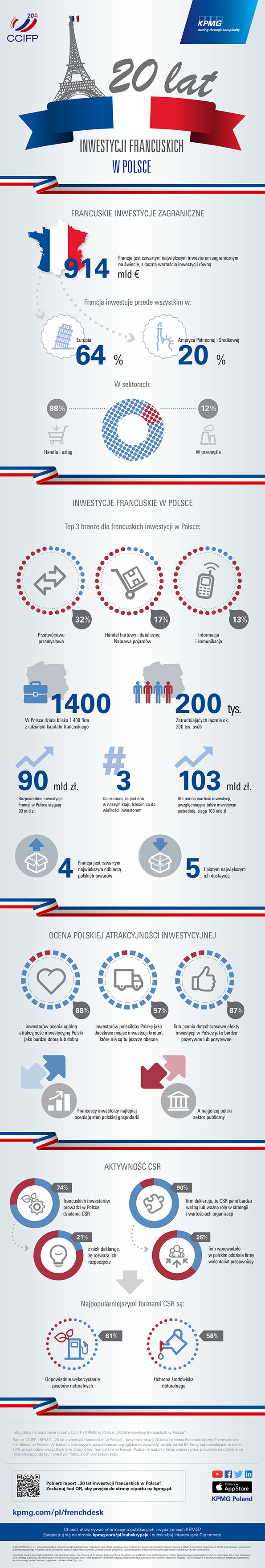 Raport CCIFP i KPMG „20 lat inwestycji francuskich w Polsce” powstał z okazji 20-lecia istnienia Francuskiej Izby Przemysłowo-Handlowej w Polsce i jest pierwsz? publikacj? zawieraj?c? szczegółowe dane na temat inwestycji i planów rozwoju przedsiębiorstw znad Sekwany. W badaniu ilościowym, uzupełnionym o pogłębione wywiady, wzięły udział 62 firmy odpowiadaj?ce za około 13% przychodów wszystkich firm z kapitałem francuskim w Polsce. Poddanie badaniu takiej części rynku pozwoliło na otrzymanie miarodajnego obrazu inwestycji francuskich w naszym kraju. Pełna wersja raportu dostępna na stronie kpmg.pl oraz ccifp.pl.