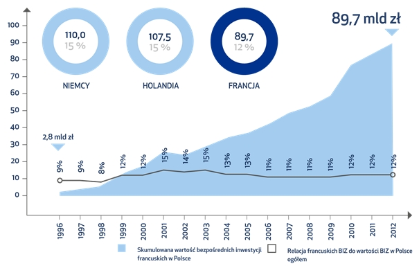 Według oficjalnych statystyk Narodowego Banku Polski, Francja jest trzecim co do wielkości inwestorem zagranicznym w Polsce. Od 2004 roku wartość skumulowanych inwestycji francuskich wzrosła dwuipółkrotnie, z 34,2 mld zł (8,4 mld euro) do 89,7 mld zł (21,9 mld euro). Duża część kapitału trafiaj?cego do takich krajów jak Holandia czy Luksemburg, ze względu na panuj?ce tam dogodne uwarunkowania prawne i podatkowe, jest następnie reinwestowana w innych krajach, najczęściej przez spółki holdingowe.