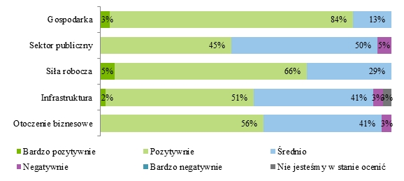 Drugim obszarem, co do którego pojawiło się najwięcej negatywnych odpowiedzi była infrastruktura. Przy planowaniu inwestycji, przedsiębiorcy zwracaj? uwagę w największym stopniu na jakość infrastruktury transportowej (29%). Niestety to właśnie ten element został wskazany jako wymagaj?cy największych zmian. Mimo zauważalnej poprawy stanu infrastruktury w Polsce, nadal przez blisko połowę respondentów jest ona oceniana negatywnie (44%).