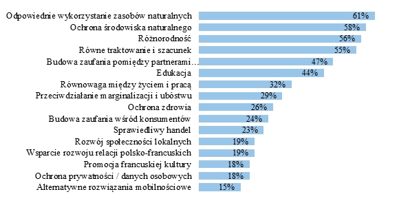 Firmy francuskie, które zainwestowały w Polsce, przykładaj? duż? wagę do społecznego wymiaru swojej działalności. Trzy czwarte z nich prowadzi w Polsce programy lub projekty CSR (Corporate Social Responsibility), a kolejne 21% rozważa rozpoczęcie takiej działalności. Większość firm prowadz?cych w Polsce CSR robi to zarówno z inicjatywy globalnego właściciela, jak i inicjatyw oddziałów lokalnych. Najwięcej przedsiębiorstw prowadzi działania w obszarze ochrony środowiska naturalnego. Aż 61% z nich dba o odpowiednie wykorzystanie zasobów naturalnych i oszczędność energii, a 58% chroni środowisko naturalne. S? to również dwa obszary, w których pozostałe firmy najchętniej deklaruj? rozpoczęcie lub zwiększenie swojej aktywności. Na trzecim miejscu jest wspieranie różnorodności w firmie (56%) oraz dbanie o zapewnienie równego traktowania i szacunek (55%). Na kolejnych miejscach znalazły się: budowa zaufania pomiędzy partnerami biznesowymi (47%), edukacja (44%) oraz równowaga między życiem prywatnym a prac?. Firmy francuskie maj? dług? tradycję prowadzenia działań z zakresu CSR, a wiele doświadczeń wywodzi się z centrali firmy lub oddziałów na całym świecie. Dobre wzorce s? coraz częściej wykorzystywane w Polsce, a do ich stosowania zachęcani s? również polscy partnerzy, czy dostawcy współpracuj?cy z firmami francuskimi.